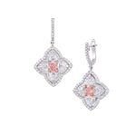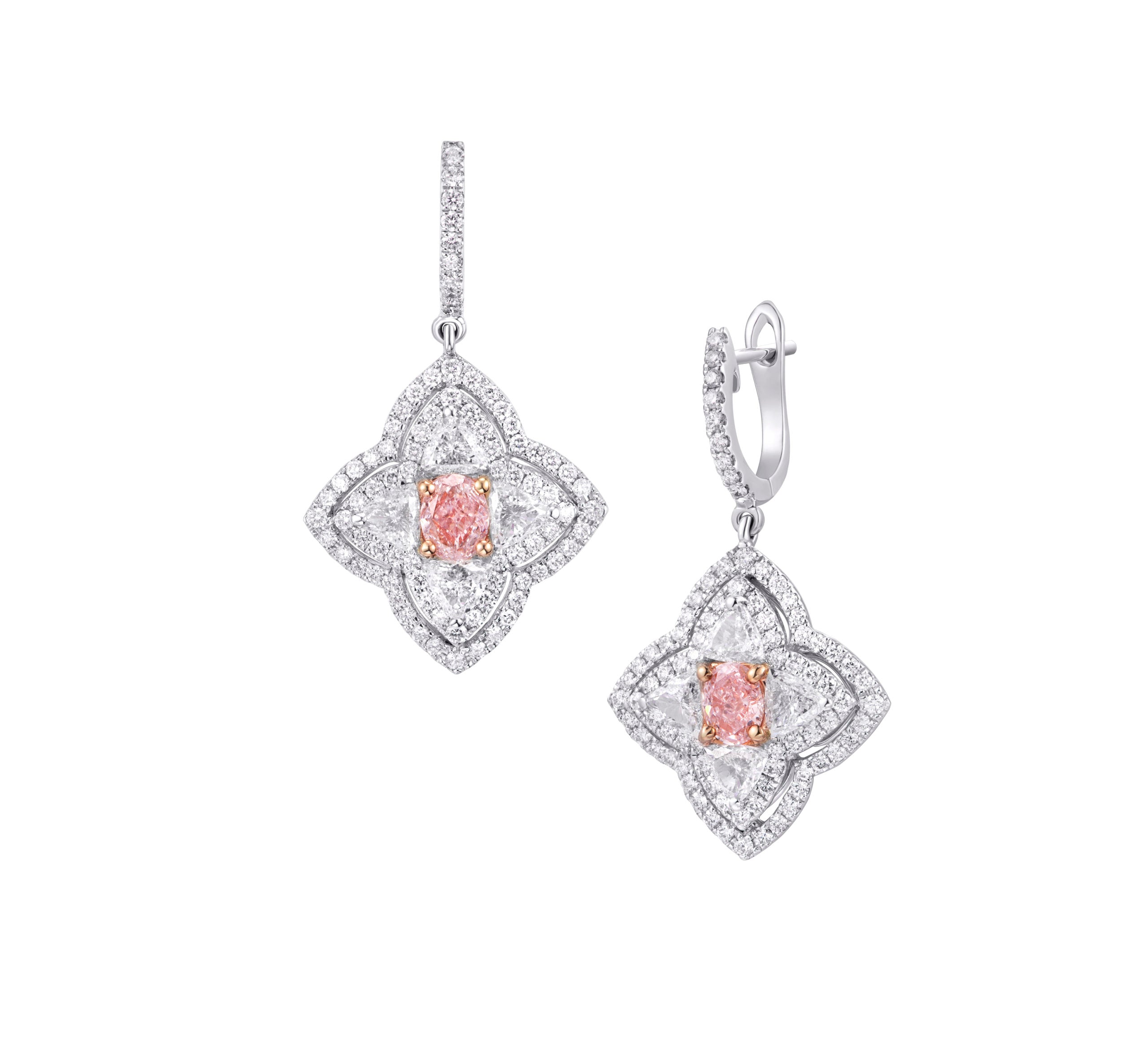 This Dazzle pair of Fine Earrings is set with 2 Pink diamonds Oval Shape 0.90carat Very Light Pink with additional flower halo setting of natural diamonds 2.65carats in top quality VS+ in clarity and D-G in color.