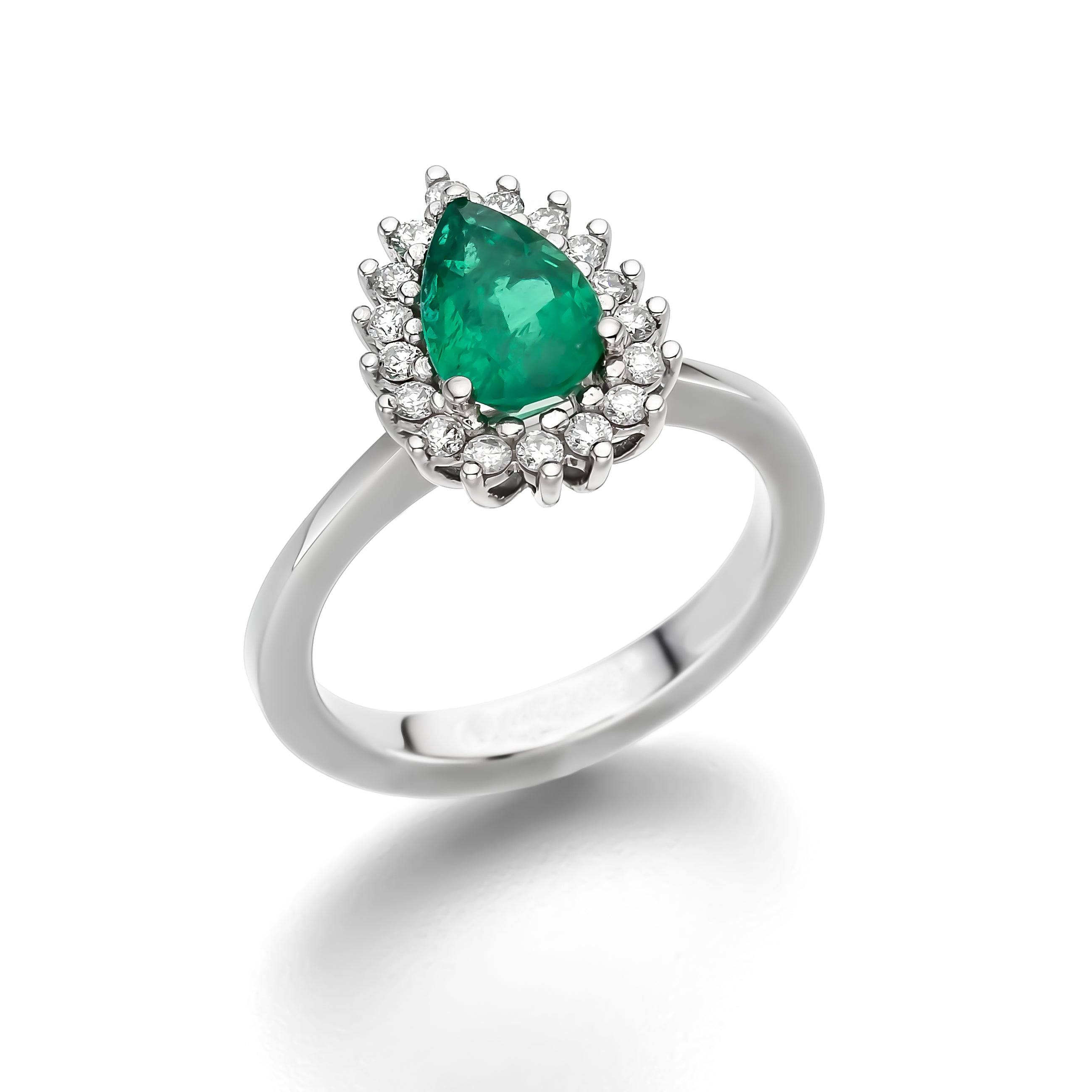 At the heart of this masterpiece lies a stunning pear-shaped 1.00-1.50-carat natural sapphire, emerald, or ruby, each revered for its rich color, depth, and enduring allure. The striking gemstone is encircled by a delicate halo of 18-20 brilliant white diamonds, with a total weight of 0.25-0.30 carats. The mesmerizing contrast between the vibrant centerpiece and the radiant diamond halo creates a breathtaking interplay of light and brilliance.