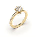 Introducing the VENUS ring, a timeless six-prong design that exudes classic elegance. At its heart lies a 1.05-carat round brilliant diamond, certified by IGI with a D color grade, VS1 clarity, and triple excellent cut, polish, and symmetry, ensuring exceptional brilliance. The band is adorned with 42 micro-pavé diamonds 0.35ct, adding a touch of sparkle that enhances the center stone's radiance and glamour the ring band with its setting. This exquisite ring is crafted in 14K Yellow gold weighing 3.16 grams. combining enduring beauty with superior craftsmanship.
